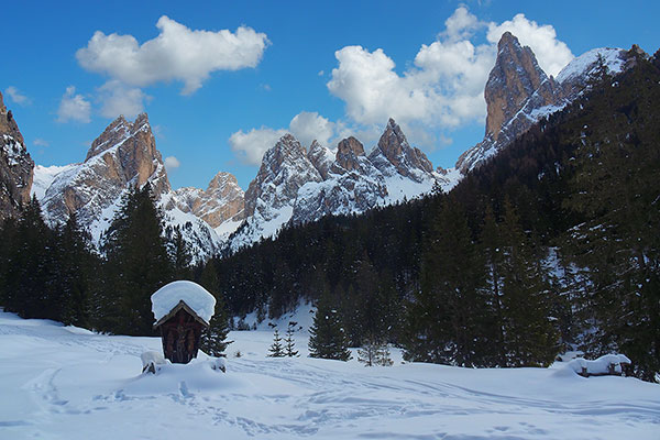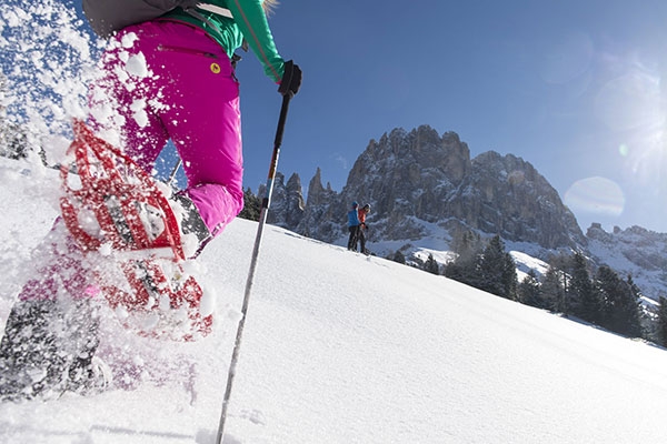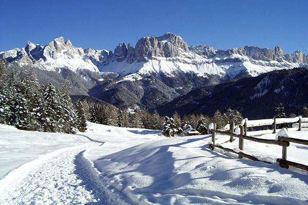 Diese kurze Schneeschuhwanderung ist auch für Anfänger und Familien geeignet. Sie führt zu einem Logenplatz mit Blick auf den Rosengarten und die Vajolettürme, den Wuhnleger. Diese Schneeschuhwanderung ist auch für Anfänger und Familien geeignet. Die Wanderung startet in Weißlahnbad und führt auf dem Forstweg Richtung „Wuhn“ (Mark. 4A). Nach einem kurzen Waldstück geht es über ausgedehnte Wiesen direkt auf den kleinen Weiher zu. Dieser Logenplatz bietet einen wunderschönen Blick auf den Rosengarten und die Vajolettürme. Dem Weg Nr. 4A weiter folgen und man erreicht die St. Sebastian Kapelle. Von dort geht es über einen Rundweg über dem Dorf Tiers zurück nach St. Zyprian und zum Ausgangspunkt der Tour.