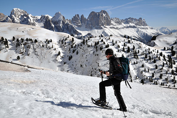 Der Aufstieg beginnt im Berghotel Piné und führt durch einen Föhrenwald in die Bärenfalle. Da der Steig oftmals schneefrei ist, kann der Aufstieg meist ohne Schneeschuhe erfolgen. Der Weg führt steil zwischen den Felswänden hinauf zum Tschafatschsattel. Nach dem Ausgang der Schlucht öffnet sich der Blick zum Hochplateau des Schlern und zur Rosengartengruppe. Weiter geht’s mit den Schneeschuhen zur Sesselschwaige und von dort über den Knüppelweg durch die Schlernschlucht hinunter zum Wegkreuz Peter Frag. Der Weg zweigt links ab und führt über die Nr. 7 und später über Nr. 4-4a hinunter zum Ausgangspunkt.