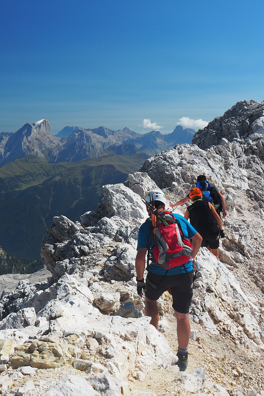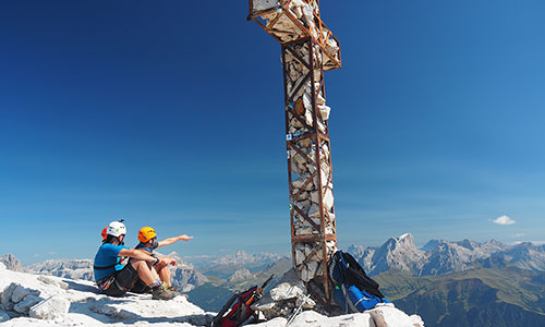 Der Kesselkogel, 3004m, ist die höchste Erhebung der Rosengartengruppe und gilt als einer der schönsten Aussichtspunkte der Dolomiten. Wegverlauf-Westanstieg: Berghotel Piné (Weißlahnbad) durch das Tschamintal zur Grasleitenhütte und weiter zum Grasleitenpass. Von der Grasleitenpasshütte wenige Minuten bis zum Einstieg, über mehrere Felsstufen aufwärts, einem breiten Geröllband folgend und zuletzt wieder über mehrere Felsbänder kletternd, unschwer zum Gipfel.Gehzeit: Berghotel Piné (Weißlahnbad) - Tschamintal - Grasleitenhütte - Grasleitenpass ca. 4 Stunden, Klettersteig ca. 1 1/2 bis 2 Stunden. Anforderung: mittel Wegverlauf-Ostanstieg: Berghotel Piné (Weißlahnbad) durch das Tschamintal zur Grasleitenhütte und weiter zum Grasleitenpass. Von der Grasleitenpasshütte hinauf zum Antermoiapass, 2770m, dann Querung unterhalb der Ostwand zum Einstieg des Klettersteiges. Der Ostanstieg gilt als etwas schwieriger, durch Leitern und Drahtseile gut gesichert ist aber auch er ohne größere Schwierigkeiten zu bewältigen. Gehzeit: Berghotel Piné (Weißlahnbad) - Tschamintal - Grasleitenhütte - Grasleitenpass ca. 4 Stunden, Klettersteig ca. 2 1/2 bis 3 Stunden. Anforderung: mittel bis schwer.