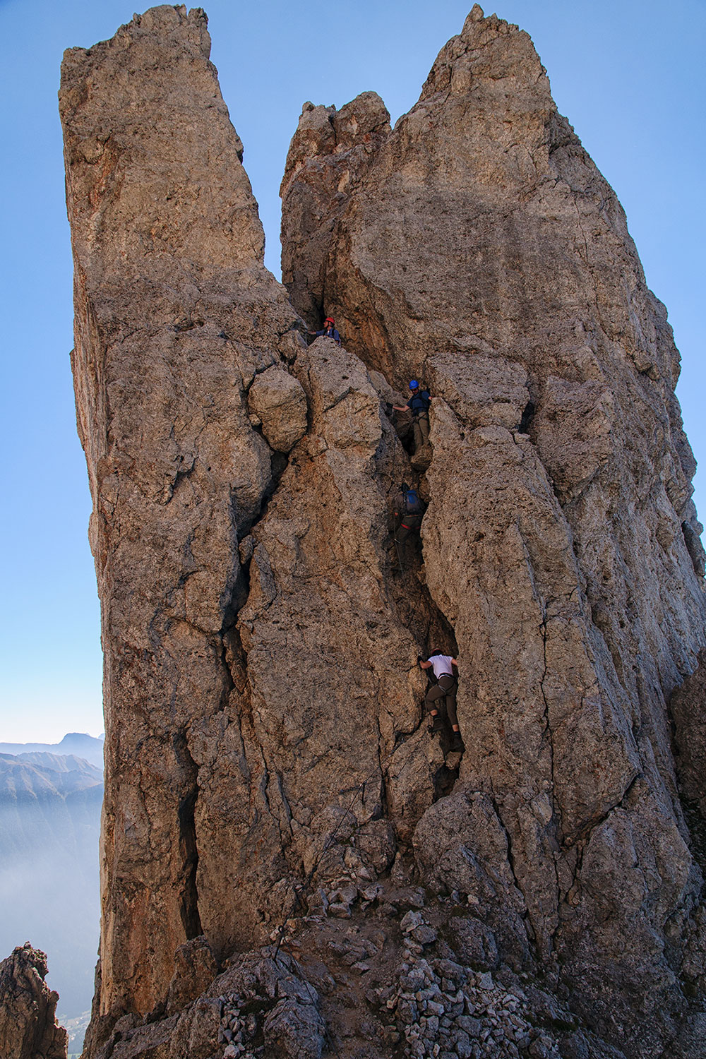 Ausgangspunkt ist der Karerpass und zwar die Talstation des Paolinaliftes. Sie fahren nun mit dem Sessellift zur Paolinahütte und von dort geht’s nach rechts, vorbei am Christomannosdenkmal, zur Rotwand- und Ostertaghütte. Bei den Hütten angekommen, kann man bereits den gesamten Verlauf des Klettersteigs erkennen. Man steigt links auf einem schmalen Weg in ca. 1 Stunde hoch bis zum Einstieg. Der Klettersteig ist recht abwechslungsreich, mal geht es aufwärts und mal abwärts, über Seile und Leitern. Am anderen Ende des Massivs endet der Klettersteig und ein Weg führt über eine Almwiese wieder zurück zur Rotwandhütte. Von dort geht man den gleichen Weg zurück zur Paolinahütte. Man kann diesen Klettersteig auch mit dem Rotwand-Klettersteig verbinden, indem man erst den Rotwand-Klettersteig besteigt (siehe Rotwand-Klettersteig) und anstatt nachher zur Hütte abzusteigen, über den Fensterleturm, eine nicht ganz einfache und Muskelkraft erfordernde Kletterpassage, direkt im Anschluss in den Masaré einsteigt. Gehzeit: Aufstieg 2 ½ Stunden bis zum Ende des Klettersteigs, Abstieg ½ Stunde bis Rosengartenhütte, nochmals ½ Stunde bis Paolinahütte Höhenmeter: 155m Kombination Rotwand-Masaré-Klettersteig ca. 6 Stunden.Schwierigkeitsgrad: mittel